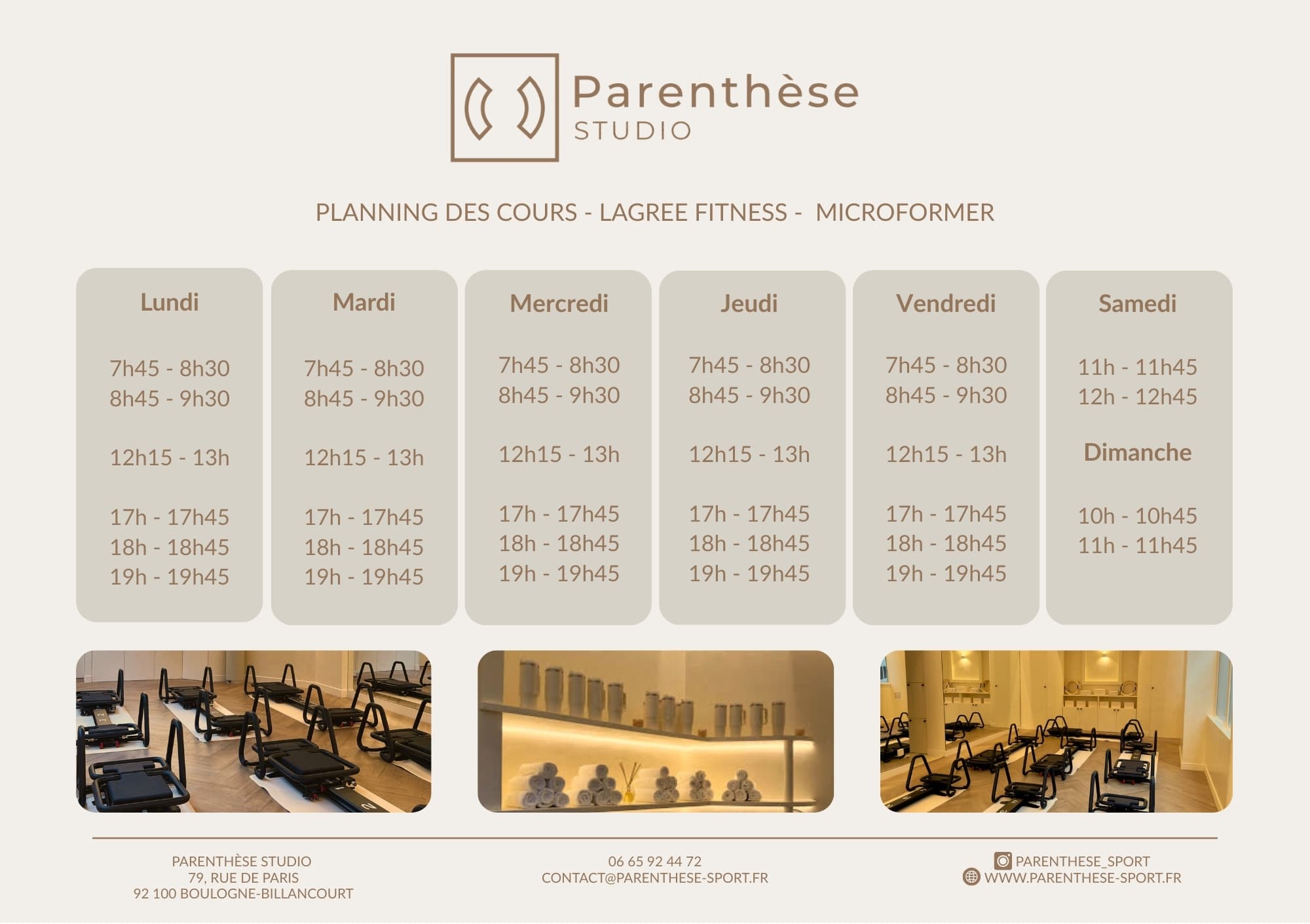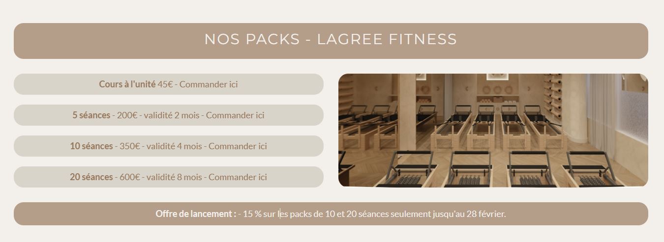Paranthèse Studio welcomes you throughout the week for Lagree classes. This is a complete workout that delivers lasting results while respecting the body. Using slow, controlled movements performed on a special machine, Lagree Fitness strengthens deep muscles, improves core stability, and corrects posture. The continuous work intensely engages the body. It develops strength, endurance, and stability without impacting the joints. Swipe your magnetic badge at the entrance.